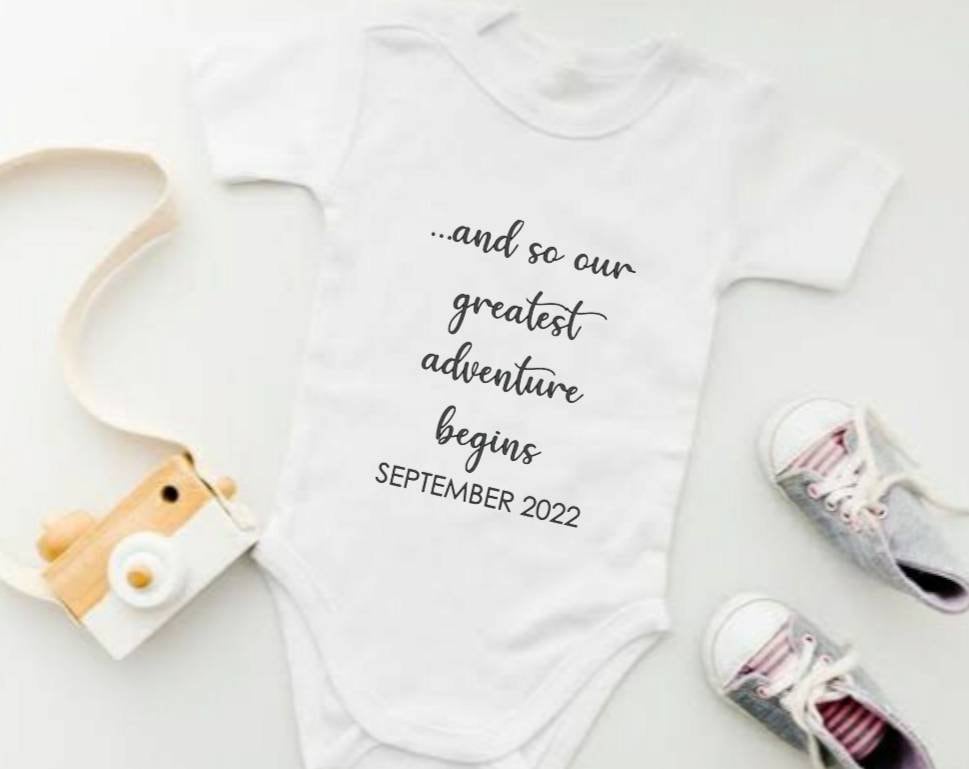 And so our greatest adventure begins! A special keepsake bodysuit and photo prop to share the wonderful news that you are expecting.