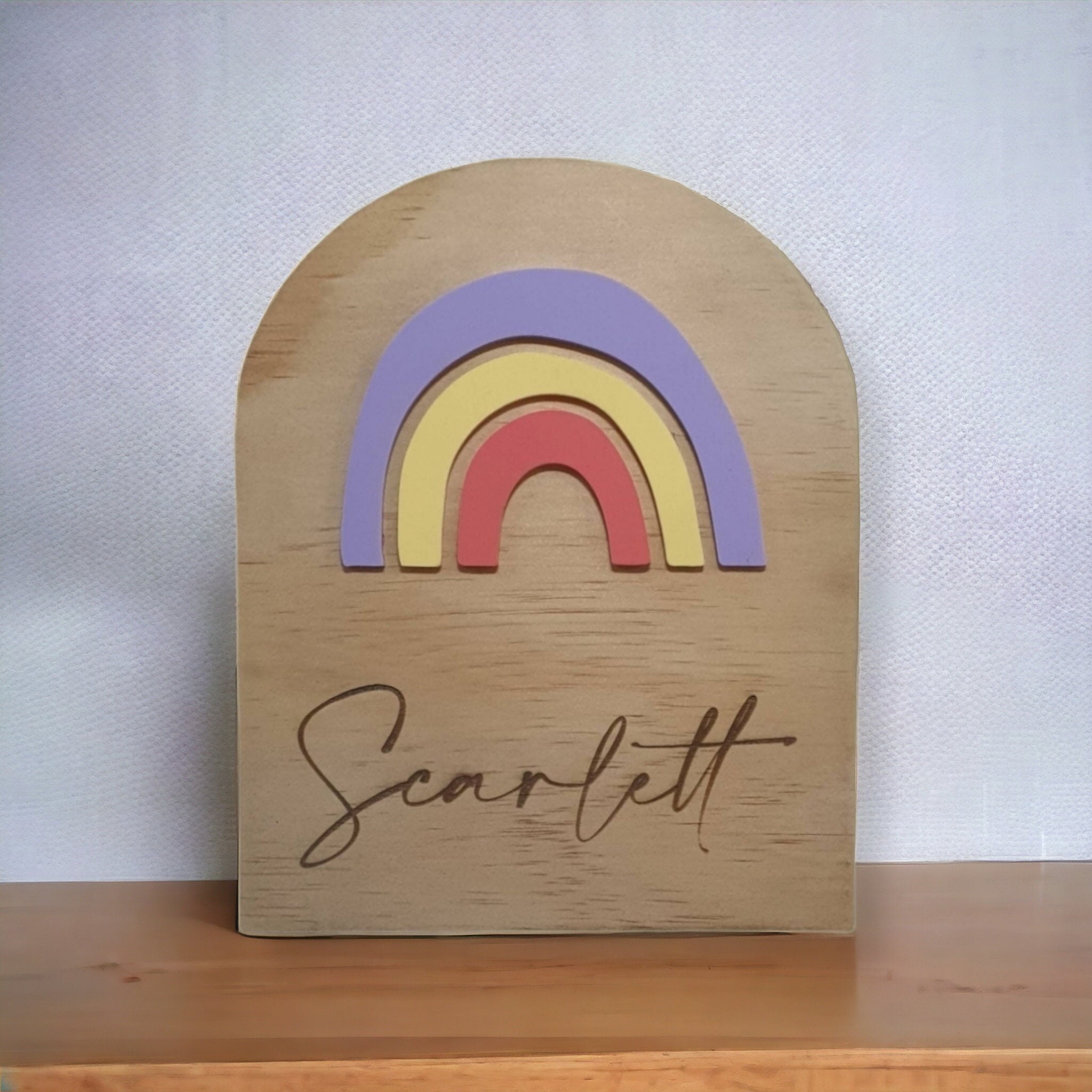 Sit it on a shelf, on an easle or stick it on the wall or bedroom door. This arched name plaque is a beautiful touch to your child's bedroom.