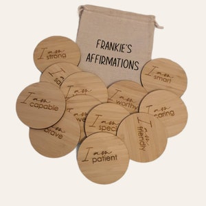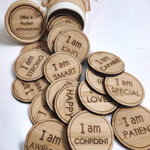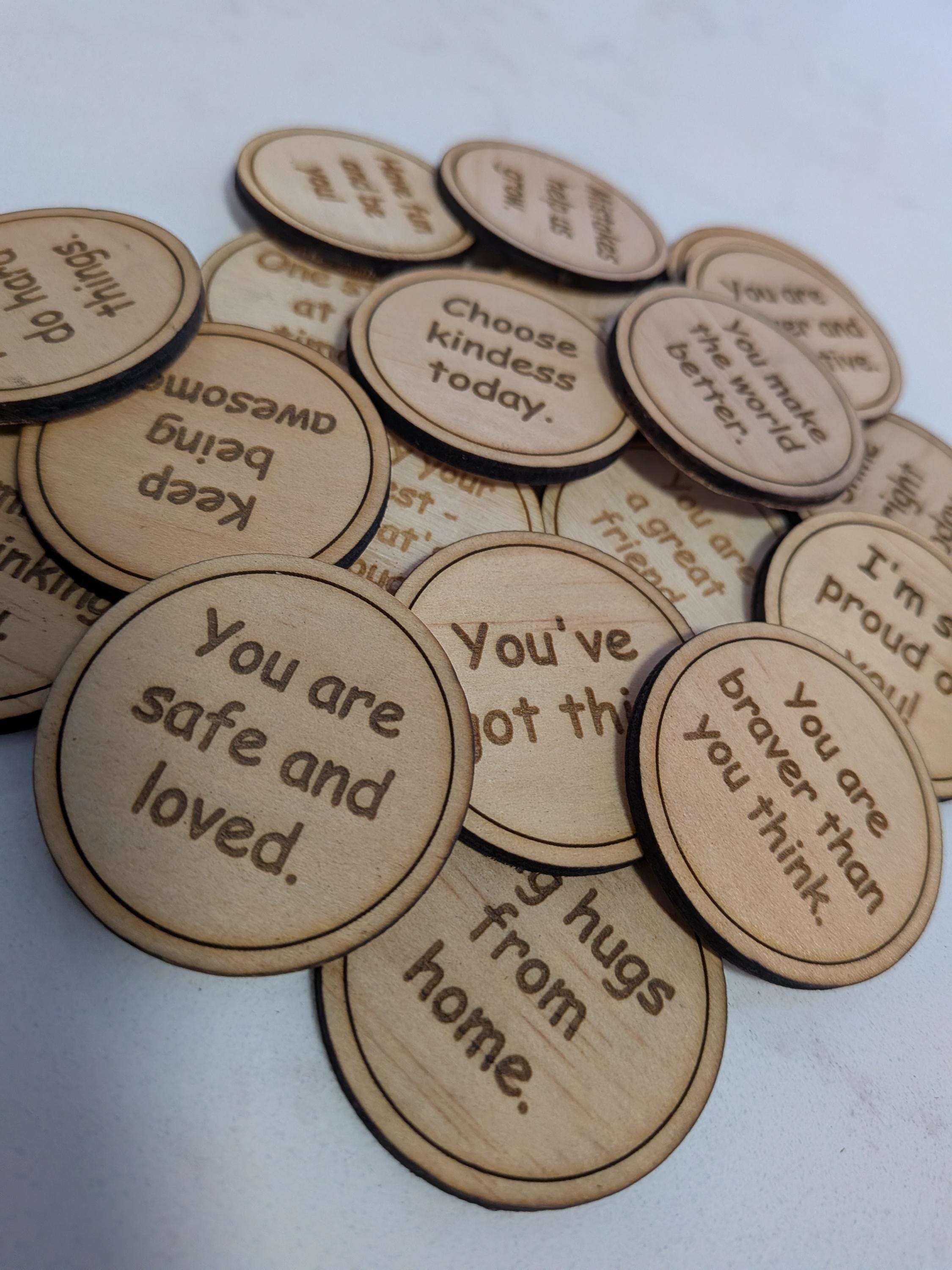 CONTENTS: Ă— 20 wooden tokens in each pack. The following Notes/Affirmations are engraved on each token: - You've got this. - I'm so proud of you! - Shine bright today. - Big hugs from home. - You are braver than you think. - I can't wait to hear about your day! - You make the world better. - Keep trying. You're doing amazing. - Smile! I'm thinking of you. - Mistakes help us grow. - You are a great friend. - You can do hard things. - Keep being awesome. - You are clever and creative. - You are safe and loved. - Choose kindness today. - Have fun and be you! - One step at a time. - I love your smile. - Try your best - That's enough.