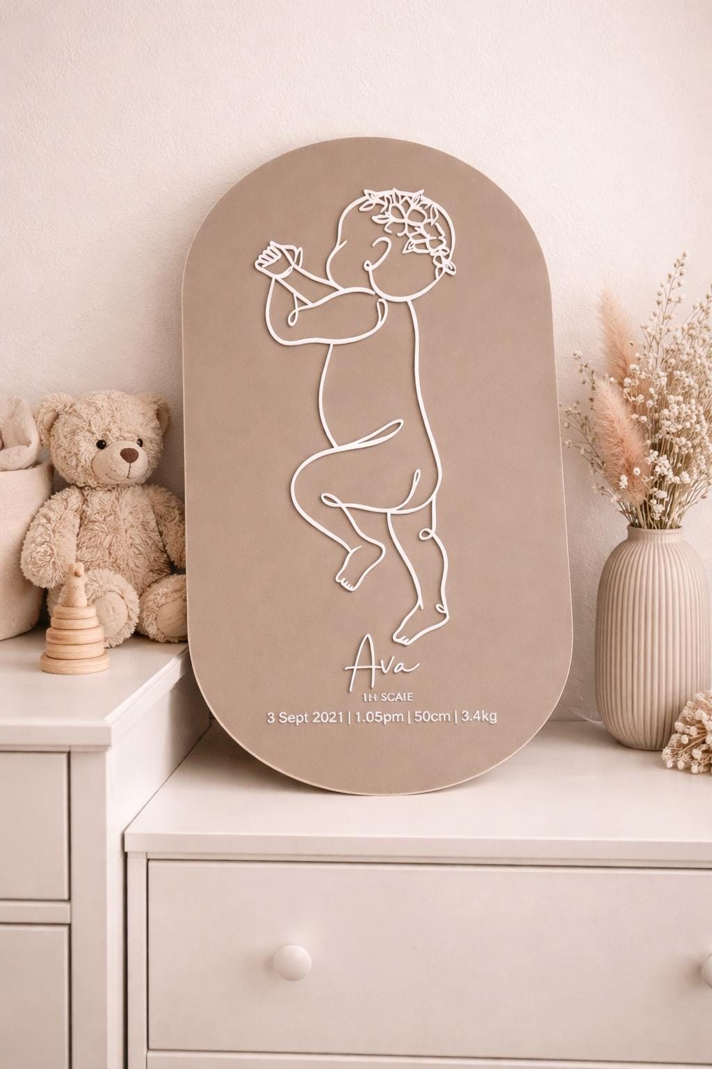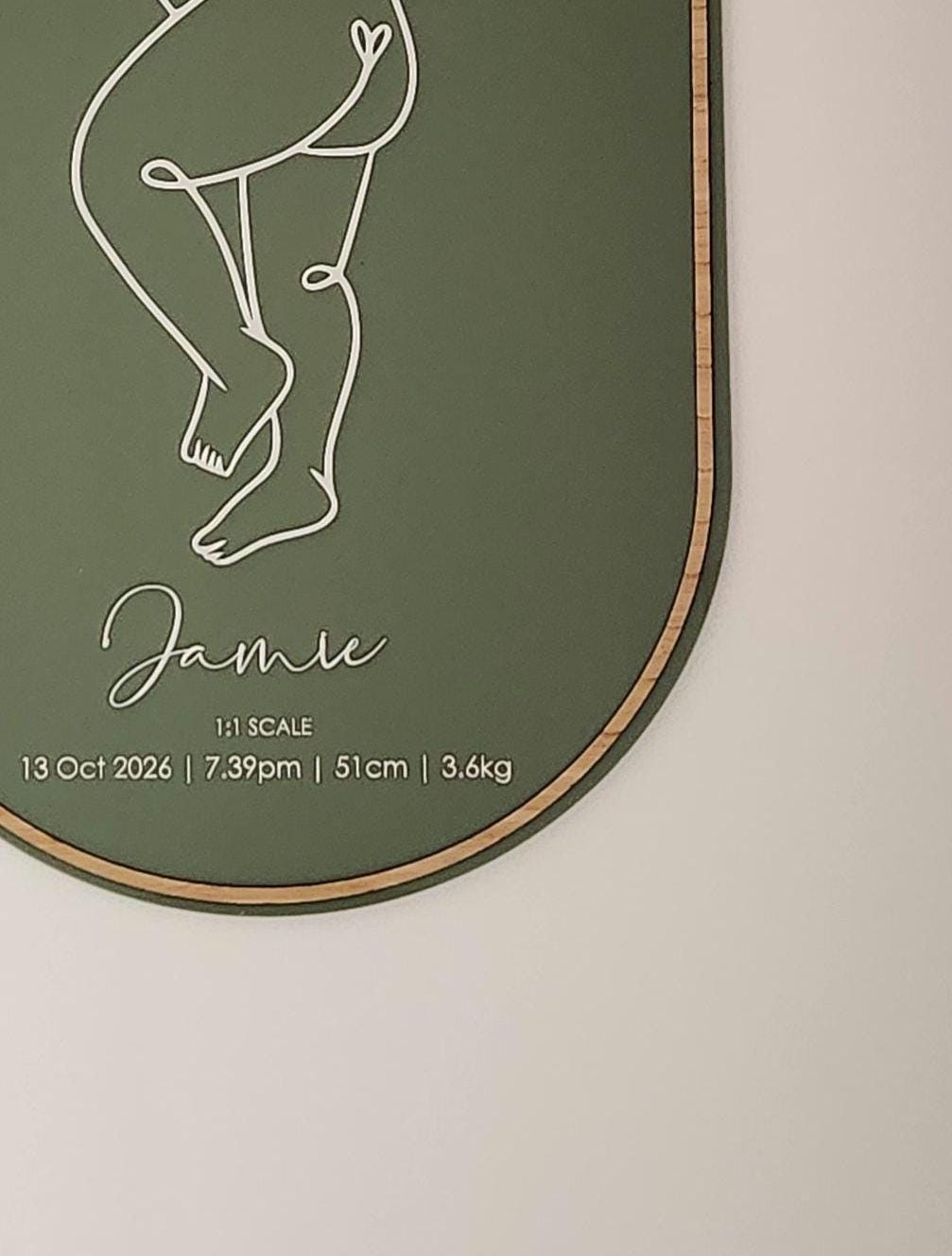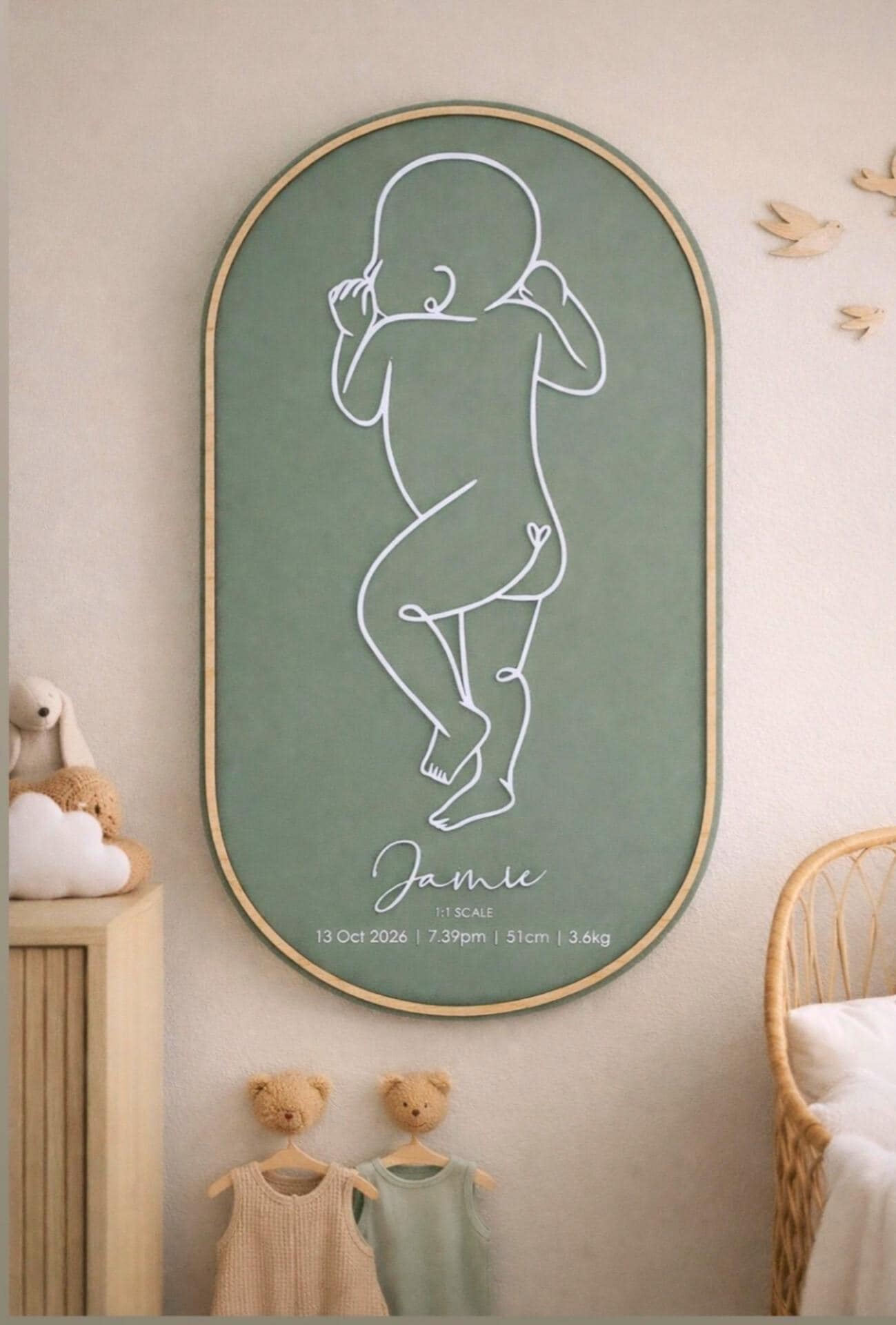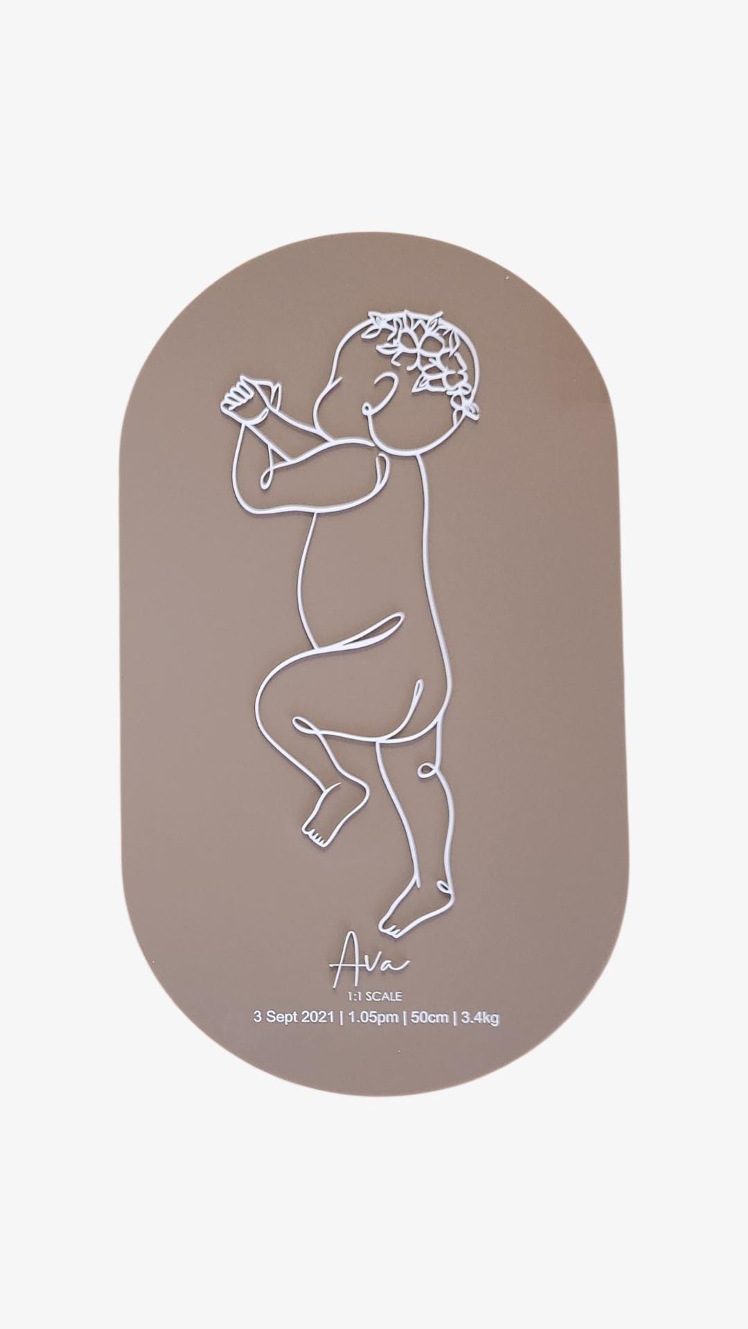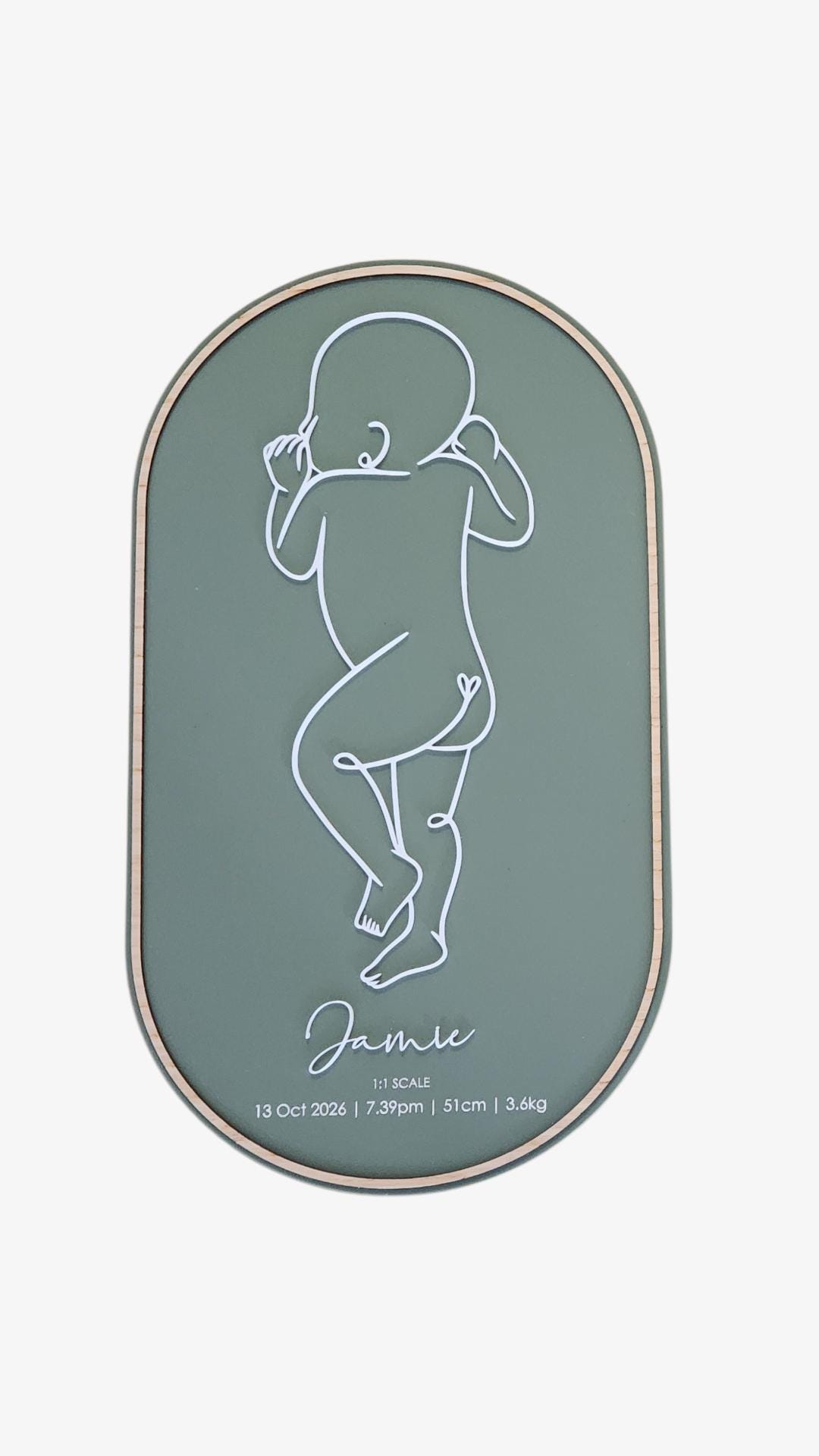 Each plaque features a 1:1 scale line illustration based on your baby’s birth length and is customised with your baby’s birth details, creating a timeless keepsake for your nursery or home.
