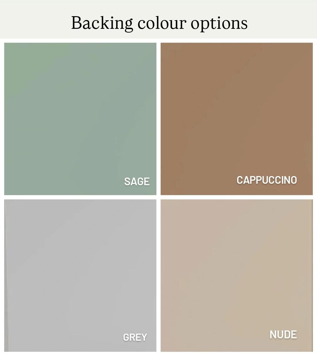 • Backing colour options include - Sage, Cappuccino, Grey or Nude