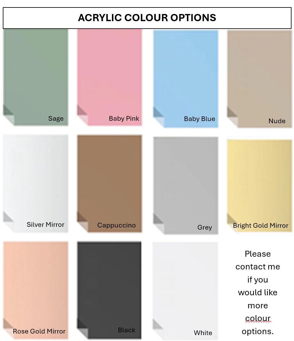 ‼ ADDITIONAL INFORMATION • Please keep item out of reach of children. • If your order is damaged in transit, please advise us within 24 hours. • Colours of acrylic products may appear slightly different in person compared to what you see on your screen. Variations can occur due to differences in screen resolution, display settings, lighting, and device types. While we do our best to photograph and display our products as accurately as possible, slight colour differences between the digital image and the physical item may occur. • To clean, gently wipe with a soft dry cloth. Avoid harsh chemicals or abrasive cleaners.