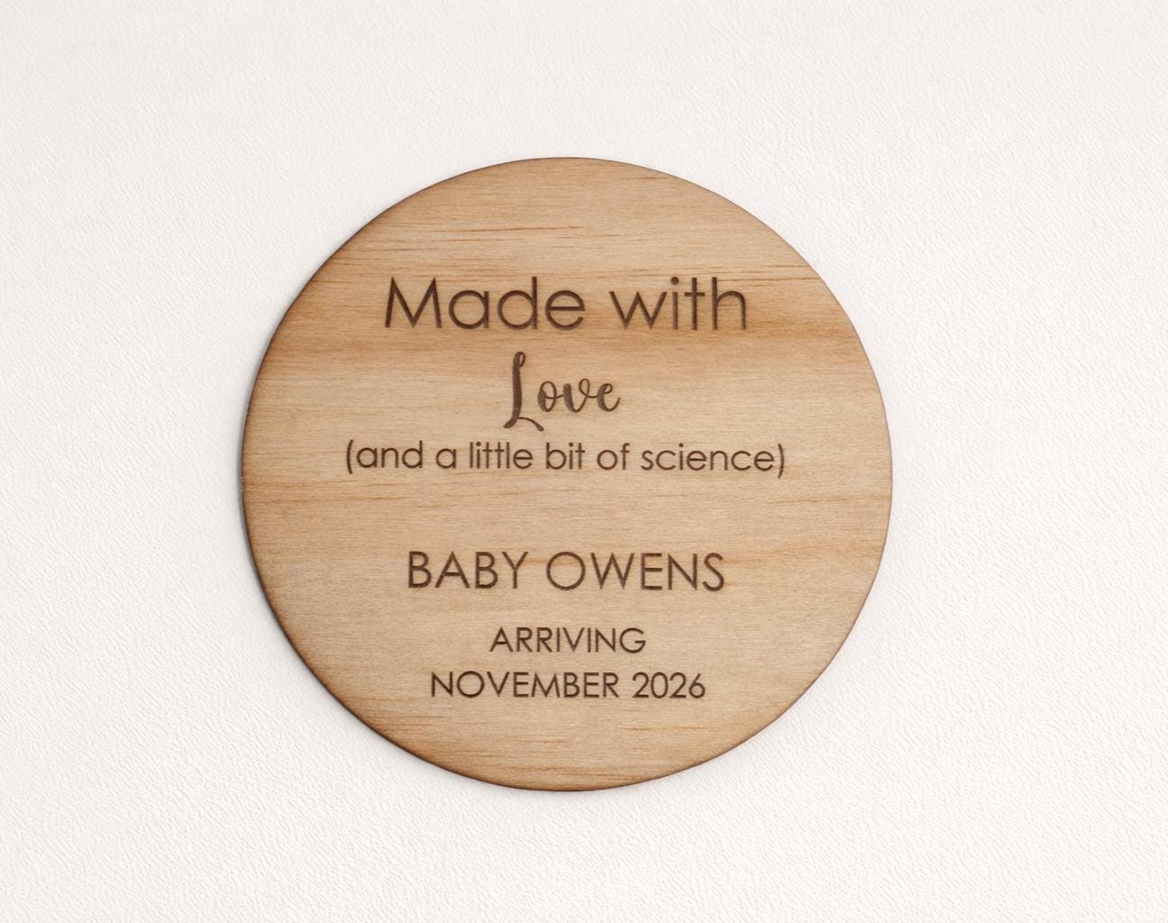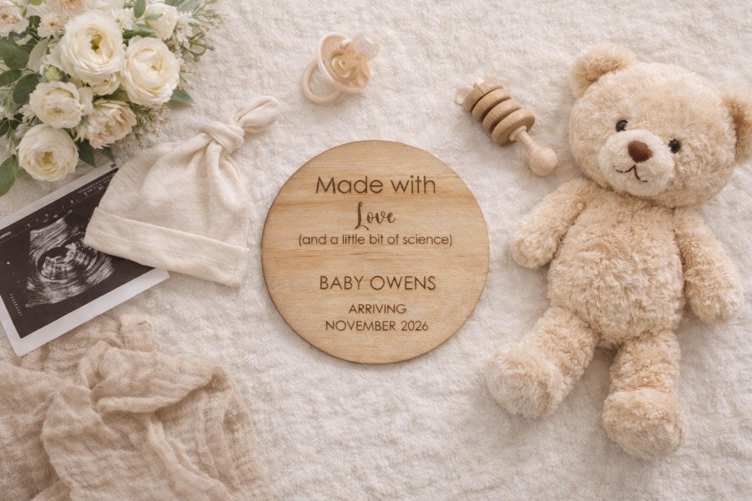 Made with love (and a little bit of science). A beautiful disc to announce the beautiful news of your IVF baby.